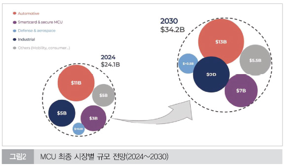 향후 마이크로컨트롤러(MCU) 시장은 전통적인 자동차·산업용 중심 성장에서 스마트카드·보안, AI 탑재 MCU, 전기차 전장용 MCU로의 포트폴리오 확장이 핵심 전략이 될 전망이다. 특히 AI, 전기화, 안전·보안이 결합된 MCU 솔루션은 `30년 글로벌 MCU 시장 성장의 핵심 축으로 자리 잡을 것으로 예상된다. Yole Group(www.yolegroup.com)의 최신 보고서에 따르면, 글로벌 MCU 시장은 `24년부터 `30년까지 연평균 성장률(CAGR) 6%를 기록해 `30년 340억 달러(약 49조3,000억 원) 규모로 성장이 전망된다.