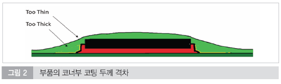 전통적인 용제형 코팅제(아크릴, 우레탄)는 도포 후 경화되기 전까지 액체 상태로 존재한다. 이 과정에서 표면 장력(Surface Tension)과 중력(Gravity)의 상호작용으로 인해, 코팅액이 표면 에너지가 높은 부품의 날카로운 모서리에서 밀려나거나 아래로 흘러내리는 현상이 발생한다. 이러한 현상을 유발하여, 평평한 표면에는 수십 마이크론의 두께가 형성되지만, 정작 보호가 가장 시급한 모서리 부분은 코팅 두께가 5μm 미만으로 얇아지거나 심지어는 금속이 완전히 노출되는 결과를 초래한다.