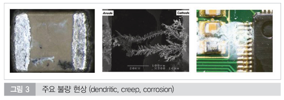 형성된 전해질 하에서 전압(예: 24V)이 인가되면 금속 이온이 이동하여 수지상 결정인 덴드라이트가 성장한다. 이는 인접한 도체 간의 전기적 단락(Short)을 일으켜 시스템의 영구적인 고장을 초래한다.