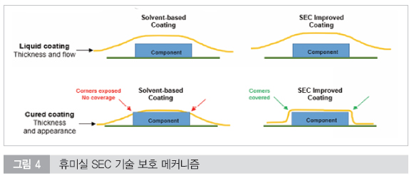 전자기기의 경량화는 부품의 소형화를 불러오고 있다. 작은 부품이 널리 사용됨에 따라 컨포멀 코팅 공정이 까다로워지고 있다. 최근 생산현장에서는 부품 리드나 커패시터 모서리와 같은 가장 장리에 대한 코팅 두께 확보에 집중하고 있다. 이러한 요구에 부응하기 위해 휴미실은 SEC(Sharp Edge Coverage) 기술을 선보였다. SEC 기술은 컨포멀 코팅 산업의 오랜 난제였던 ‘제품 코너 부분 코팅 박리’문제를 소재의 물성 특성 제어를 통해 근본적으로 해결했다. 특히 ‘1B59SEC’는 탁월한 모서리 및 코너부분의 커버력과 더불어 낮은 수분 투과율, 우수한 열충격 저항성을 겸비하여 최적의 솔루션을 제공한다.