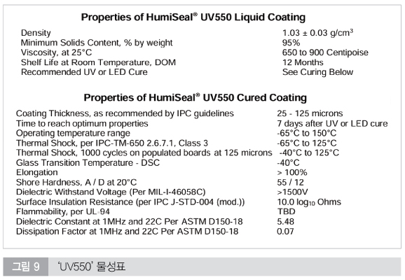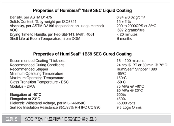 IPC-CC-830 및 MIL-I-46058C 규격을 충족하며, 절연파괴전압 5000V 이상의 우수한 성능을 보장한다. 합성 고무 기반의 고성능 솔루션인 휴미실 1B59SEC에 관한 물성은 그림 5에서 보여준다.