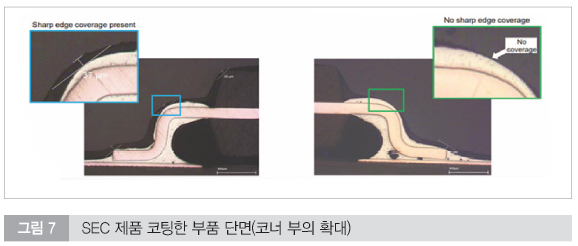 휴미실 기술팀은 SEC 기술의 우수성을 입증하기 위해 실제 부품 리드의 단면을 현미경으로 정밀 분석하였다. 그림 6에서는 SEC 제품으로 코팅한 부품의 단면을 보여주고 있다.