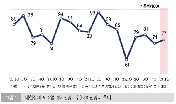 대한상공회의소가 전국 2,208개 제조기업을 대상으로 조사한 ‘2026년 1분기 기업경기전망지수(BSI)’는 77로 집계됐다. 직전 분기 대비 3포인트 상승했지만, 18분기 연속 기준치(100)를 하회하며 경기 회복의 체감 강도는 여전히 제한적인 수준이다.
