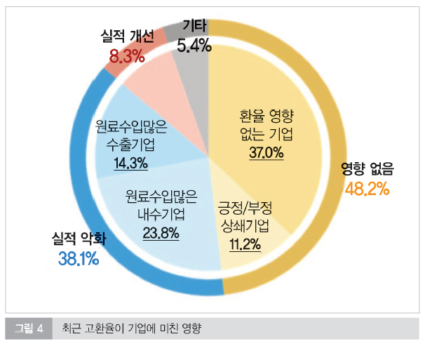 특히 내수 중심 기업 중 원부자재 수입 비중이 높은 기업(23.8%), 수출기업임에도 수입 원가 상승 부담이 더 큰 기업(14.3%)이 실적 악화를 체감하고 있는 것으로 나타났다. 반면 환율 영향이 크지 않다는 응답은 48.2%로, 사업 구조상 환율 영향이 제한적이거나 긍·부정 효과가 상쇄된 경우가 다수를 차지했다.