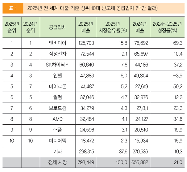 `25년 글로벌 반도체 매출 상위 10대 기업 순위에서는 NVIDIA의 독주 체제가 한층 공고해졌다. 가트너의 예비 집계에 따르면, NVIDIA는 지난해 반도체 매출 1,000억 달러(약 135조 원)를 돌파한 최초의 기업으로 기록될 전망이며, 삼성전자와의 매출 격차는 530억 달러(약 71조6,000억 원)까지 확대될 것으로 예상된다. NVIDIA는 `25년 전체 반도체 시장 성장분의 35% 이상을 단독으로 견인할 것으로 분석됐다.