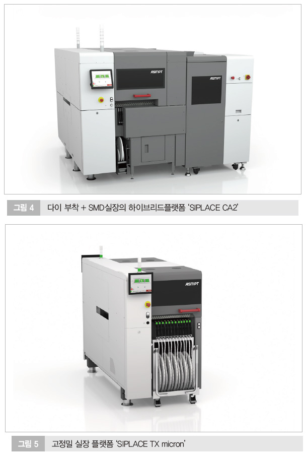 SIPLACE CA2는 웨이퍼에서 직접 다이를 고속으로 부착하면서 SMT 부품도 동시에 실장하는 하이브리드 플랫폼이다. 시간당 최대 54,000 다이 및 76,000 SMD를 ±10㎛?@?3σ 정밀도로 실장할 수 있다.