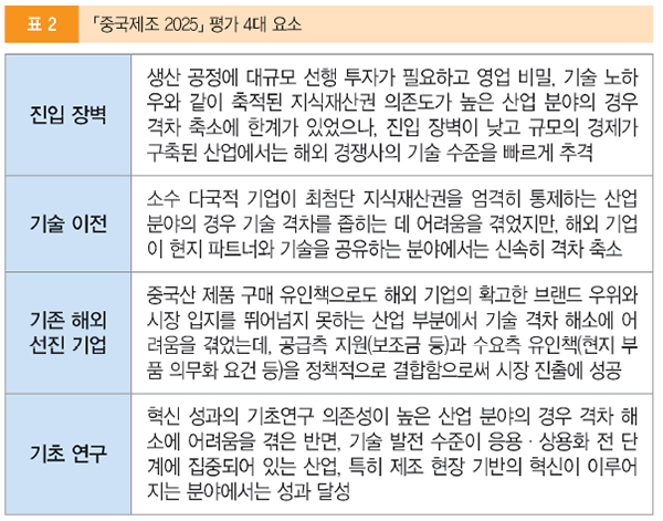 한국산업기술진흥원(KIAT)과 미중경제안보검토위원회(USCC)의 최신 분석에 따르면, 중국은 반도체 등 일부 첨단 분야의 수치적 목표 미달에도 불구하고 전기차, 조선, 범용 반도체 등에서 압도적 성과를 거두며 미국과 대등하게 경쟁할 수 있는 광범위한 제조 생태계를 구축하는 데 성공한 것으로 평가된다. 특히 한국의 주력 산업인 로봇, 자동차, 배터리 분야에서 이미 한국의 경쟁력을 추월했다는 평가이다.
