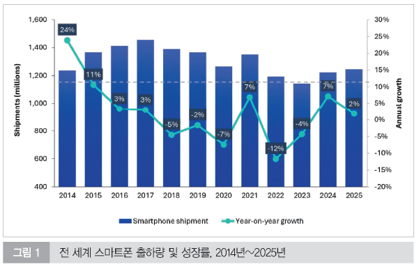 지난해 상반기까지 글로벌 스마트폰 시장은 완연한 회복세에 접어든 듯 보였다. 시장조사업체 옴디아(Omdia)의 최신 데이터에 따르면, `25년 전 세계 스마트폰 출하량은 전년 대비 2% 증가한 12억5,000만 대에 이를 전망이다. 이는 팬데믹 이후 공급망 혼란이 극에 달했던 `21년 이후 최고 수치다.