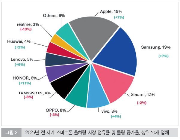 이러한 성장은 애플과 삼성전자의 강력한 플래그십 공세가 주효했다. 애플은 아이폰 17 시리즈의 폭발적 수요에 힘입어 연간 2억4,000만 대 이상의 출하량을 기록하며 3년 연속 세계 1위 자리를 수성했다. 삼성전자 역시 갤럭시 S 및 Z 시리즈의 ‘온디바이스 AI’ 마케팅이 성공하며 수년간 지속된 역성장의 고리를 끊어내는 데 성공했다. 특히 삼성은 중저가 라인업인 A 시리즈에서도 점유율을 회복하며 수익성과 물량이라는 두 마리 토끼를 잡는 전환점을 맞이했다.