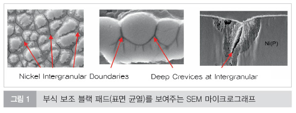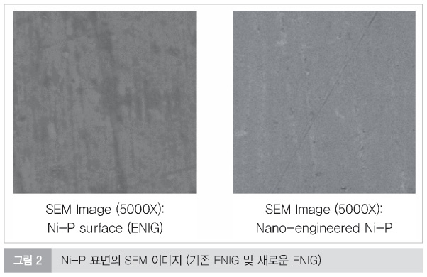 SEM 이미지(그림 2)는 Ni-P 표면과 나노 공학 처리된 Ni-P 표면(새로운 ENIG)을 보여준다. SEM 이미지에서 볼 수 있듯이 순수 Ni-P 표면은 매우 비(非) 균일한 다발성 피트(Multiple Pits)와 검은 영역을 보여준다. 그러나 나노 공학 처리된(차단층 포함) Ni-P 표면(새로운 ENIG)은 어떠한 검은 영역이나 피트도 보여주지 않고 매우 매끄럽고 균일하게 보인다.