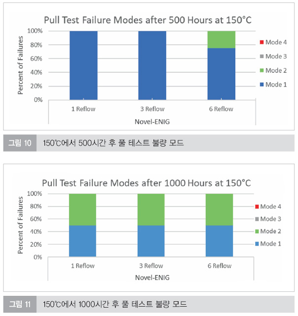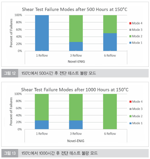 그림 10, 그림 11, 그림 12, 그림 13에서 볼 수 있듯이, 1, 3, 6회의 리플로우 사이클 후와 500시간 및 1000시간의 150℃ 노출 후에 어떠한 모드 4 불량(취성 솔더 조인트 실패)도 관찰되지 않았다.