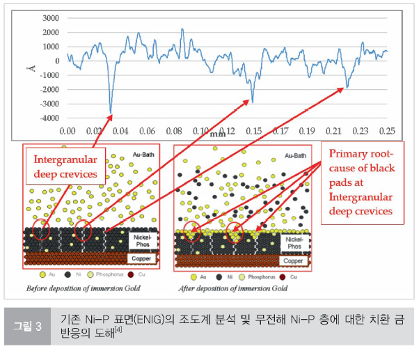 기존 ENIG의 경우 침지 금 공정은 갈바닉 치환 반응법(galvanic displacement reaction, Ni 원자를 Au 원자로 대체)을 이용한다. 적절하게 제어되지 않으면 치환이 빠르게 발생하여 일반적으로 ‘블랙 패드’ 또는 Ni의 과다 부식으로 알려진 Ni 부식이 발생할 수 있다. 이로 인해 부서지기 쉬운 솔더 조인트를 유발할 수 있다. 또한 리플로우 공정 중에 Au 층은 솔더로 용해되고 주석과 니켈 사이에 금속간화합물이 형성된다. 기존 ENIG 금속간화합물에서는 너무 많은 니켈이 주석으로 확산되어 인터페이스에 연한 Ni3P 층이 남게 된다. 이 연한 층은 부서지기 쉬운 솔더 조인트 불량의 원인이 된다.