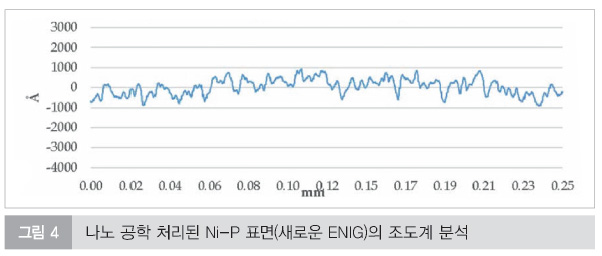 기존(ENIG) 샘플(순수)의 조도계 분석 : 구리 표면의 무전해 Ni-P 층 - 기존 Ni-P 샘플의 표면 거칠기(그림 3 참조)는 Ra 1000 Å 및 RMS 1244.794였다. 구리 표면의 무전해 Ni-P 층에 나노 공학 처리를 포함한 나노 공학 Ni-P 샘플(새로운 ENIG)의 조도계 분석 결과, 나노 공학 샘플의 표면 거칠기(그림 4 참조)는 Ra 480 Å 및 RMS 541에 도달하였다.
