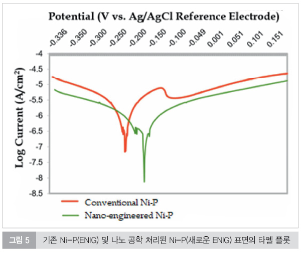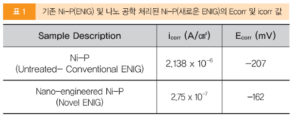 나노 공학 처리된(새로운 ENIG) 및 처리되지 않은 Ni-P 샘플의 부식 매개변수는 7% NaCl 용액에서의 동전위 분극 테스트를 사용하여 평가되었다. 이 테스트는 전위차계를 사용하여 개방 회로 전위 대비 -400mV에서 +200mV까지 약 1mV/sec의 스캔 속도로 전위를 변화시키면서 수행되었다. 기준 전극으로는 Ag/AgCl 전극을 사용했다. 타펠 플롯(Tafel plots, 그림 5 참조)을 얻고 Ecorr 및 icorr 값을 도출했다. 표 1에는 처리된 시료와 처리되지 않은 시료의 Ecorr 및 icorr 값이 나와 있다.