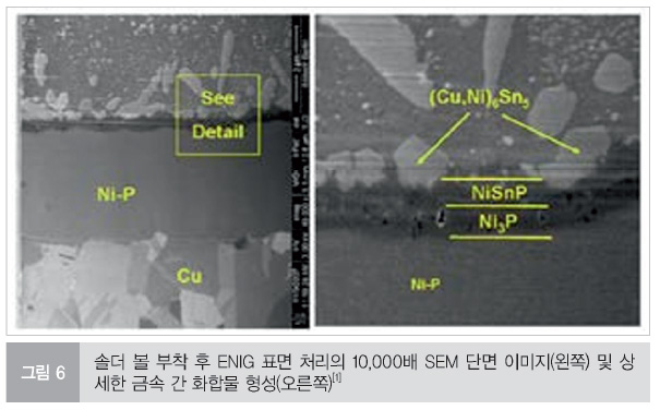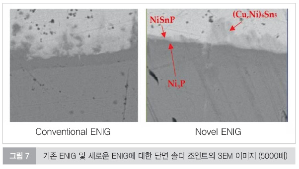 그림 7의 SEM 이미지에서 볼 수 있듯이, 차단층이 포함된 샘플(새로운 ENIG)에서는 니켈 원자 확산을 방지하는 차단층의 존재로 인해 Ni3P 및 NiSnP 층이 더 뚜렷하고 콤팩트하다. 그러나 기존 ENIG의 경우, Ni3P 및 NiSnP 층이 모두 산란/확산되어 있으며 더 두꺼운 두께를 가진다. 이러한 더 두꺼운 층들(Ni3P 및 NiSnP)은 커켄달 보이드(Kirkendall voids)를 가질 수 있으며 응력이 가해질 때 가장 약한 연결부에 응력이 집중된다. 보이드들이 합쳐지고 균열이 형성/전파되어 취성 솔더 조인트 파손으로 이어진다.[1]