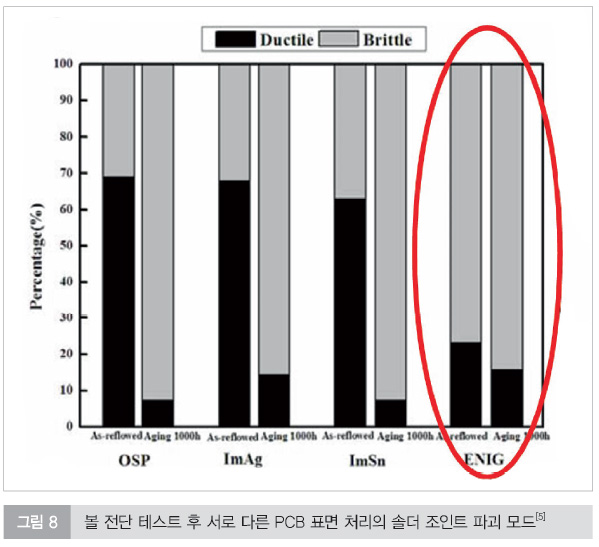 아래는 솔더 조인트의 취성 특성을 보여주는 기발표된 과학 연구의 몇 가지 참조 데이터이다. 그림 8는 리플로우된 상태와 노화(150℃에서 1000시간) 후의 Ni-Sn(ENIG) 금속 간 화합물 기반 솔더 조인트를 보여준다. 그림 8의 빨간색 타원에서 볼 수 있듯이, 전단 테스트 후 취성 파손이 주요 불량 모드이다.