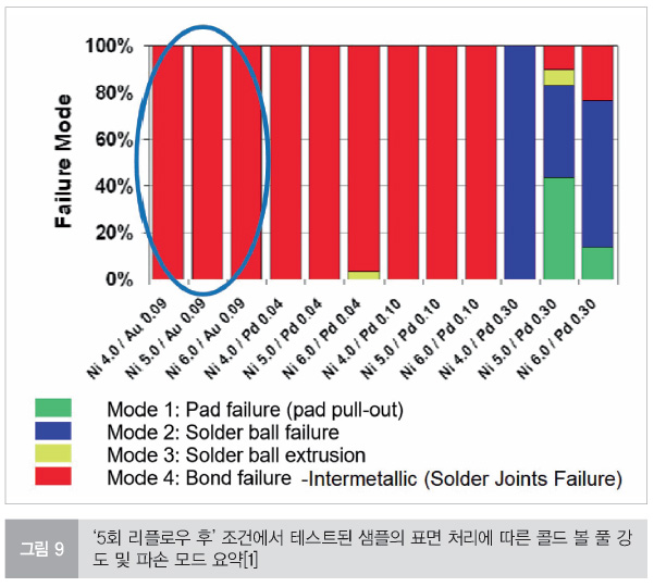 또 다른 연구에서는 5회 리플로우 사이클 후 Ni-Sn 기반 솔더 조인트에 대한 콜드 볼 풀 테스트 중의 금속 간 화합물 불량를 보여주었다(그림 9에서 파란색 타원으로 강조됨).