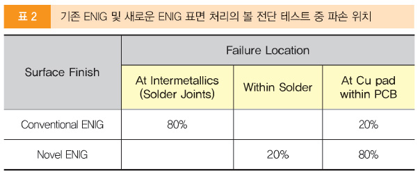 기존 ENIG에 비해 새로운 ENIG에서 볼 파손(전단)을 발생시키는 데 약 48% 더 많은 힘이 요구되었다. 표 2에 나타난 바와 같이, 기존 ENIG의 경우 불량의 80%가 금속 간 화합물에서 발생한 반면, 새로운 ENIG의 경우 금속 간 화합물에서의 불량은 전혀(0%) 없었다. 새로운 ENIG 마감과 관련된 취성 솔더 조인트 파손은 없었다.