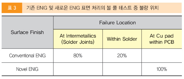 볼 파손을 만드는 데 필요한 힘은 기존 ENIG 마감의 경우 평균 1698그램인 것에 비해 새로운 ENIG의 경우 평균 2717그램이었다. 기존 ENIG에 비해 새로운 ENIG에서 볼 불량(풀)을 발생시키는 데 약 60% 더 많은 힘이 요구되었다. 표 3에 나타난 바와 같이, 기존 ENIG의 경우 불량의 80%가 금속 간 화합물에서 발생한 반면, 새로운 ENIG의 경우 금속 간 화합물에서의 불량은 전혀(0%) 없었다. 새로운 ENIG 마감과 관련된 취성 솔더 조인트 파손은 없었다.