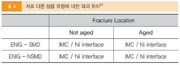 다른 발표된 연구(표 4)에서는 두 가지 종류의 Ni-Sn 기반 금속 간 화합물(ENIG)이 리플로우 직후(시효 처리 전)와 시효 처리 후(150℃에서 1000시간) 전단 및 인장 시험 중 금속 간 화합물/솔더 접합부에서 파손(취성)을 보이는 것으로 나타났다. 참고로, IMC는 금속 간 화합물(솔더 조인트)을 의미한다.